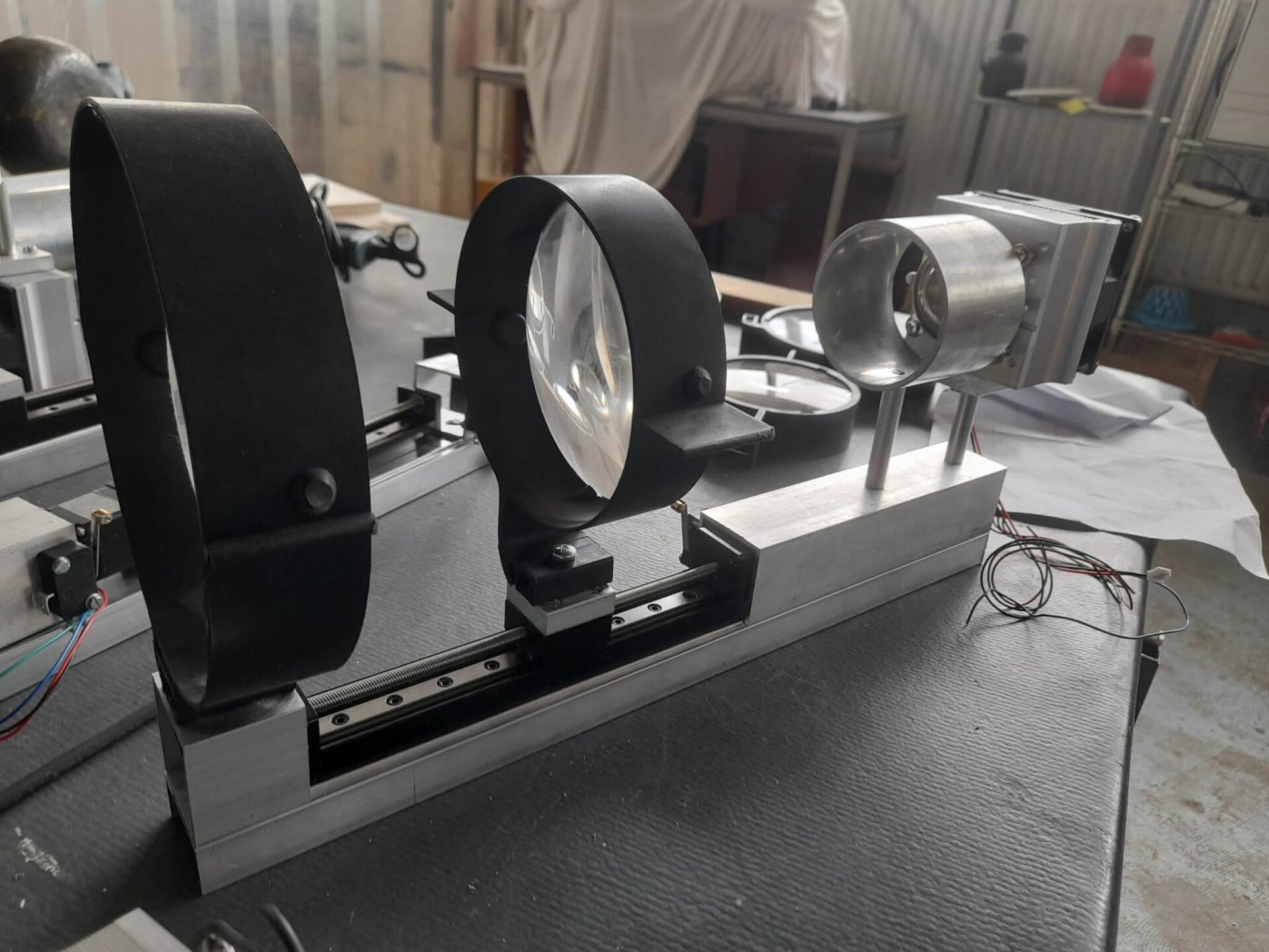 The concept of this work is the strengthening interaction that sound and light have with each other. This work consist out of 3 super bright light sources that shine through different layers. A story is told by projecting constant changing shadows controlled by ambient background noise. The lenses change their focal point by automatically moving back and forth.