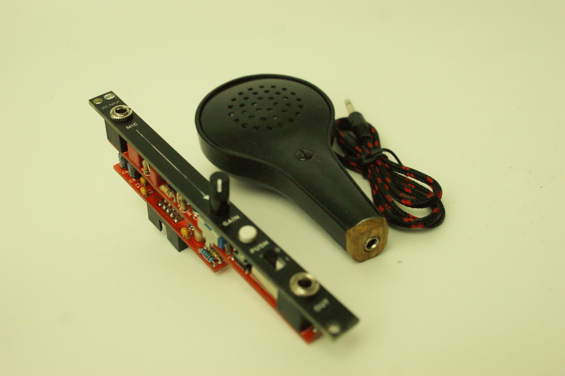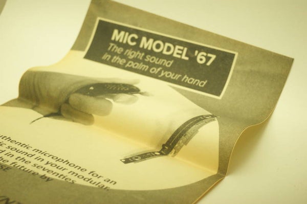 The mic comes in a box including an interface for Eurorack, a spare (modern) electet mic for clean sound and a numbered poster (only 25 where made), riso printed on old newspaper paper.